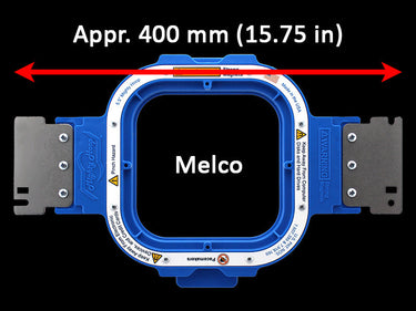 These Mighty Hoops (magnetic embroidery hoops) fit the Melco 400 mm (appr. 15.7 inch) Sew Field.