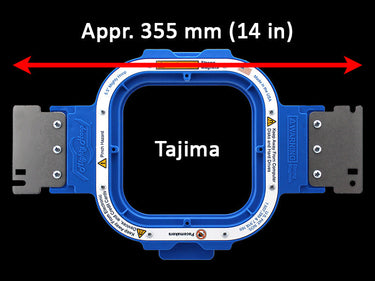 These Mighty Hoops (magnetic embroidery hoops) fit the Tajima 360 mm (appr. 14.2 inch) Sew Field.