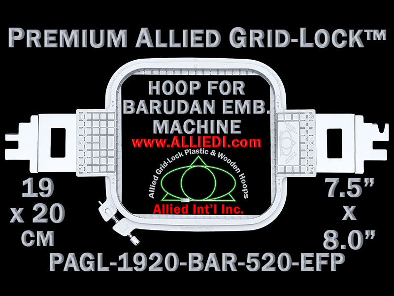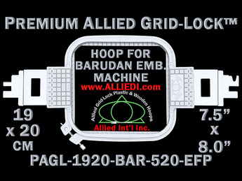 Premium Allied Grid-Lock 19 x 20 cm (7.5 x 8 inch) Barudan Embroidery Hoop - 520 mm Arm Spacing - EFP Type Brackets (Clips)