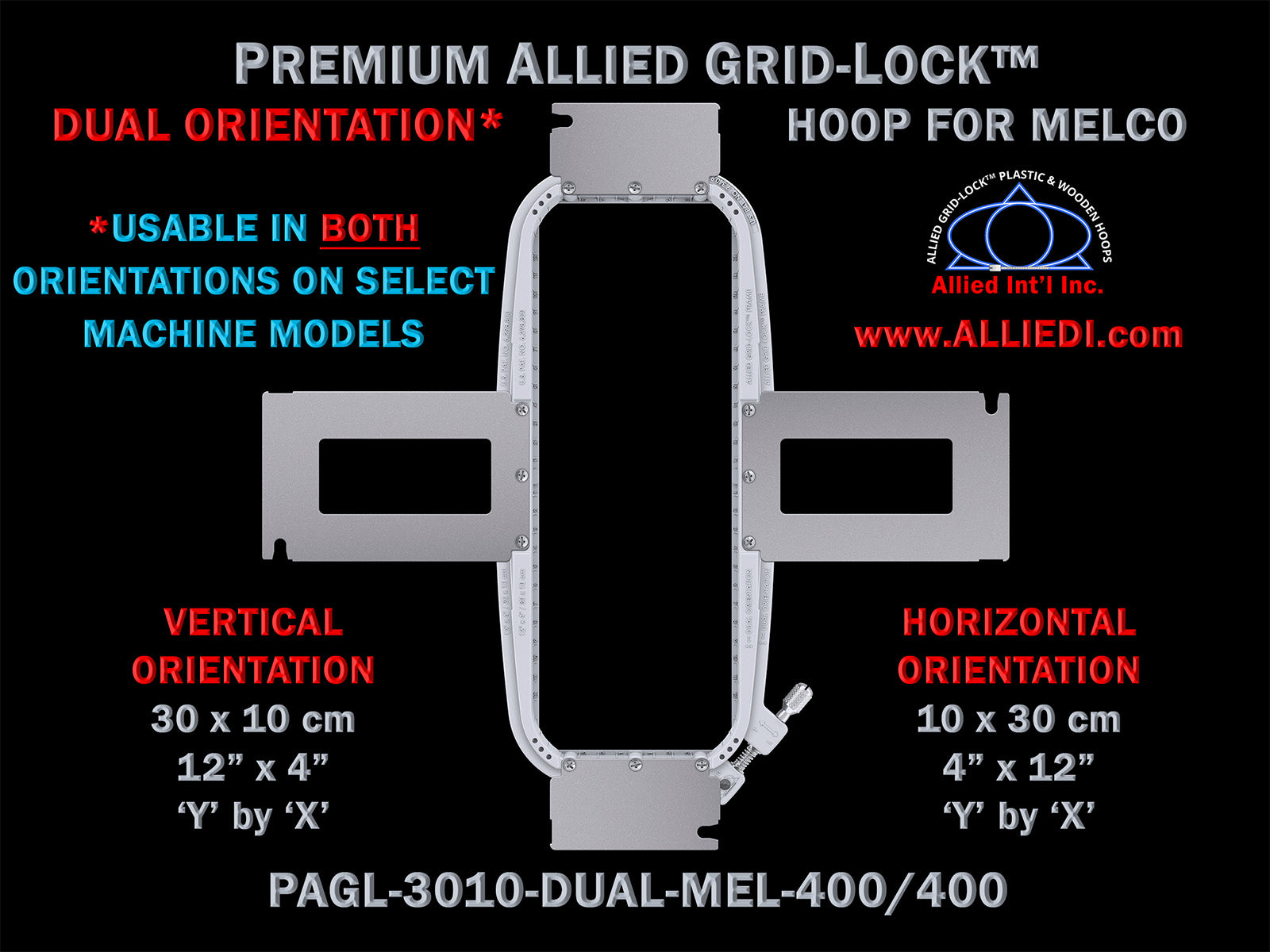 Premium Allied Grid-Lock 30 x 10 cm (12 x 4 inch) Dual Orientation Melco Embroidery Hoop - 400 mm Arm Spacing